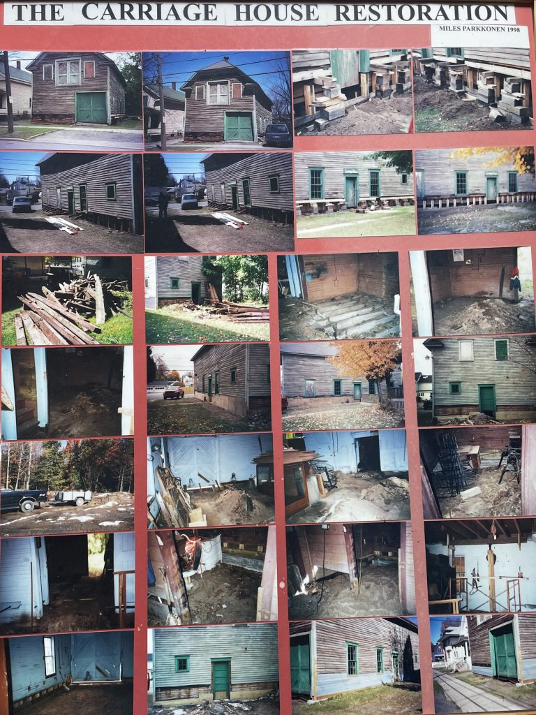 Bob Johnson wired the Carriage House with lights and outlets. Matt Jarvi, Robert Dobson and I installed a new floor upstairs to use as a place for archives. The building was restored for about $5,000. Thanks to Miles Parkkonen for his time and energy to restore this building. And like most historic buildings there is upkeep. Dave Dompierre took a step in securing funding to have the Carriage House painted. In 2017, a significant bequest to the historical society enabled the board to contract out a commercial painting company to apply an exterior coat on the museum and the Carriage House. Because the museum has newer siding, it still maintains an attractive appearance. However, by 2023, the 125-year-old exterior of the Carriage House was showing a serious need for upgrading.